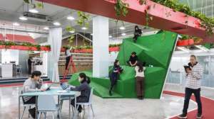 The office serves as the new Beijing headquarters for the Leping Foundation, a non-profit. It measures 1,100 sq m (11,840 sq ft) and, most notably, includes a running track available to any employees who want to stretch their legs. Above it is a suspended planter full of greenery. Staff are encouraged to partake in the gardening, and its vegetables and herbs, as well as produce from other hydroponic gardens nearby, are harvested and prepared on-site for lunch each day in an open kitchen.