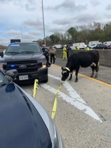 A busy stretch of highway in Virginia was brought to a stand-still when a cow jumped out of a livestock trailer and went running down the roadway. Virginia Department of Transportation traffic cameras were recording Tuesday afternoon as Virginia State Police troopers and other personnel chased after the loose bovine on Interstate 64 in Chesapeake